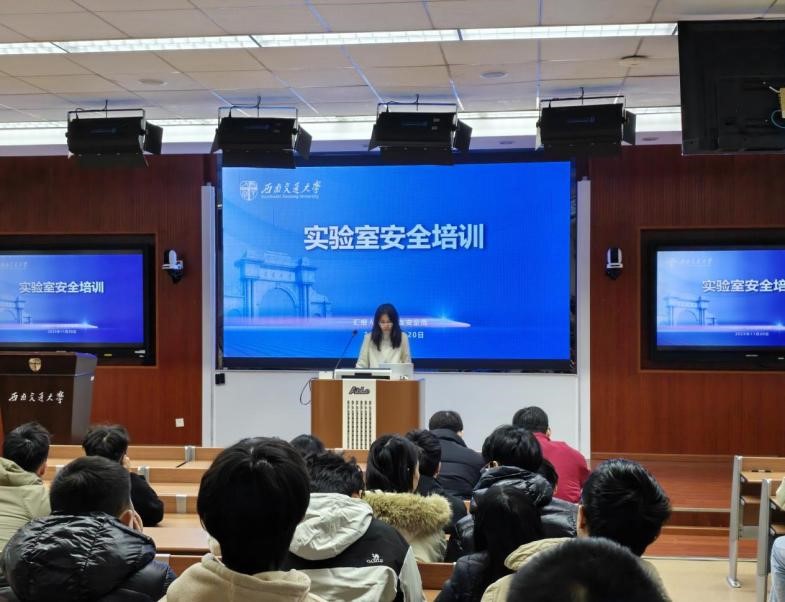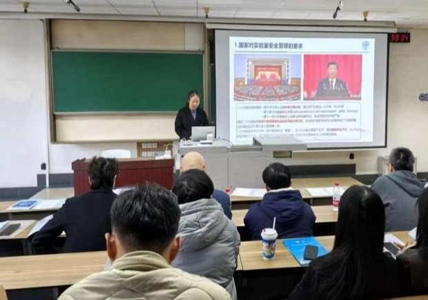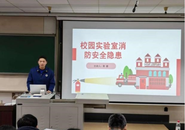 实验室安全管理》为题,从“国家对实验室安全管理的要求”“我校实验室安全管理工作”“我们身边的安全隐患”与“我校实验室安全教育宣传活动”等四个方面进行宣讲。她从国家宏观要求、学校管理体系、身边具体隐患到校园安全活动,层层递进,逻辑清晰,有效提升了师生对实验室安全体系的整体认知,为筑牢安全防线奠定了坚实的思想基础。随后,蒋豪进行消防安全培训,他以触目惊心的真实案例为切入点,围绕办公区与实验室的环境安全、防火灭火、用电规范等关键环节展开,并重点强调了办公室用电安全、气瓶供应商资质核验、逃生面罩配备及实验室通风等实操细节,将安全要求落到了实处。