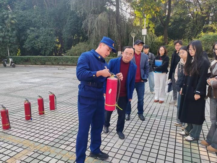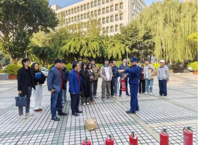 应急演练阶段,蒋豪组织全体师生前往大学生会堂前的空地,进行了灭火器的实操演练。在他的专业指导下,每位师生都亲手操作,熟练掌握了灭火器的正确使用方法。