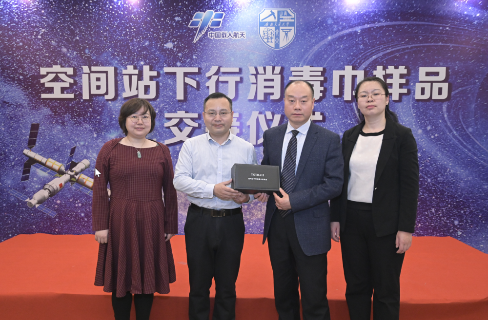 移交了空间站下行消毒巾样品盒,这是中国空间站第一批下行的应用试验样品,经“神舟十二号”航天员乘组使用后,搭载返回舱回到地面,用于开展跟踪评价和相关科学试验。科研团队在学校的大力支持下,克服各种困难,形成了为空间站持续提供抗菌材料的条件,将持续为保障天宫空间站舱内微生物安全和航天员健康提供重要支撑。据悉,我校研发的抗菌消毒技术和仿生纳米杀菌材料还参与申报并获批了2项空间技术验证项目,相关地面实验正有序展开。