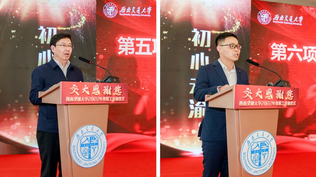 赵人达教授代表荣休教职工进行发言。他深情回顾了自己在交大工作与成长几十载校园时光,表达了对学校的感激之情和深深眷恋,并表示将继续心系教书育人、心系交大发展,发挥余热为学校发展贡献力量。信息科学与技术学院的何海军老师作为青年教师代表发言,他表示,将接过前辈们的“接力棒”,传承和延续好代代交大教师对学生、对学校的深情和爱,不负所托奉献韶华,为学校和国家的发展矢志奋斗。