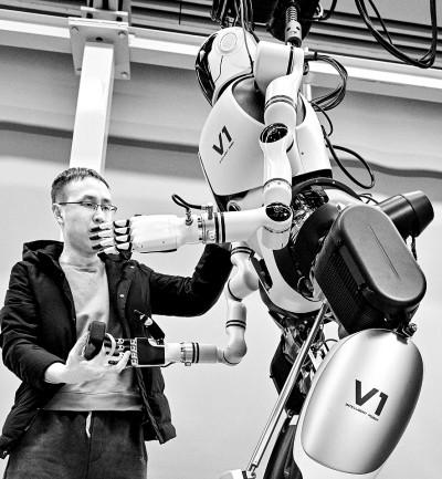 中国科学院自动化研究所人形机器人攻关团队科研人员在多模态人工智能系统全国重点实验室调试机器人。新华社发