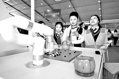 第六届世界声博会上,小朋友们在参观体验一款弈棋机器人(2023年摄)。新华社发