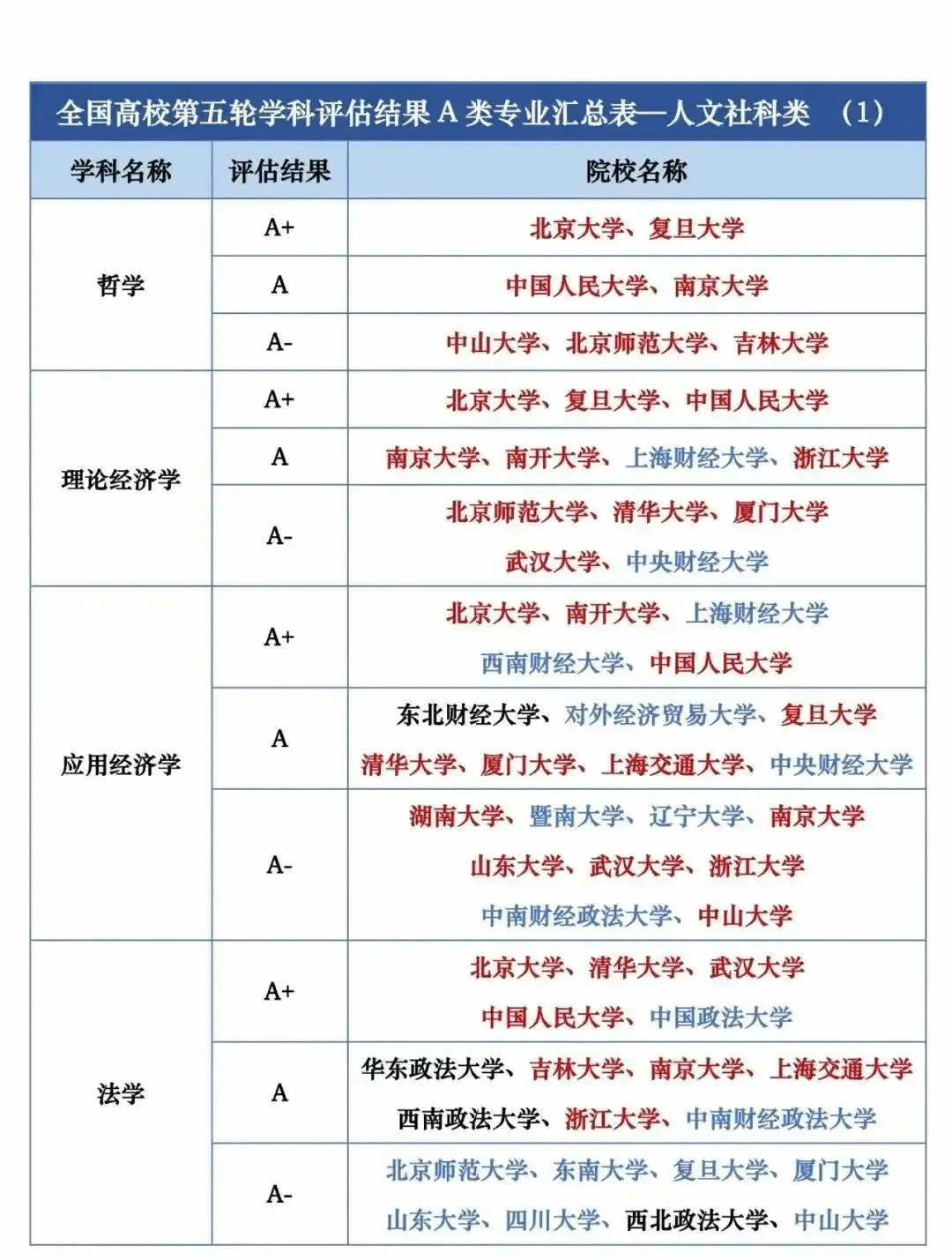 全国第五轮学科评估结果A类按照学校汇总