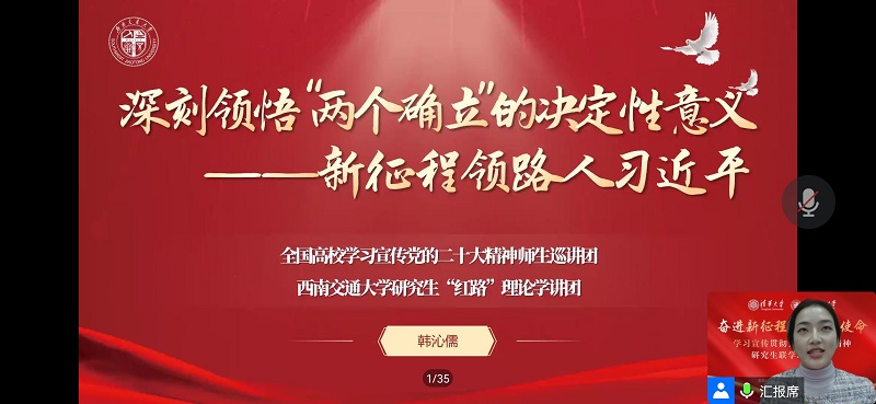“红路”研究生理论学讲团成员、外国语学院2020级硕士生韩沁儒以《深刻领悟“两个确立”的决定性意义——新征程领路人习近平》为题讲述了习近平总书记亲自谋划、亲自领导、亲自指挥,造就了非凡十年的伟大变革。新征程上,“两个确立”正指引着具有悠长文明的民族和国家进行着人类历史上气势如虹、激动人心的伟大实践。
