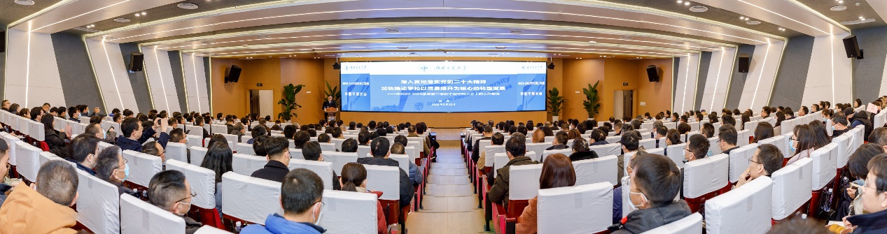 杨丹以《深入贯彻落实党的二十大精神 加快推动学校以质量提升为核心的转型发展》为题做工作部署。在回顾学校2022年主要工作时,他表示,过去一年,学校第十五次党代会胜利召开,立德树人彰显新成效,科技创新取得新突破,人才师资队伍建设开创新局面,教育对外开放呈现新气象,深化改革迈上新台阶,支撑保障实现新提升……一系列重要办学成果的取得,是党政班子成员、全校各职能部门、各院系和全体师生克服疫情影响,团结奋斗的结果。杨丹在系统全面总结工作的同时,也对全校上下一年来的不懈努力与辛勤付出表达了最衷心的感谢。
