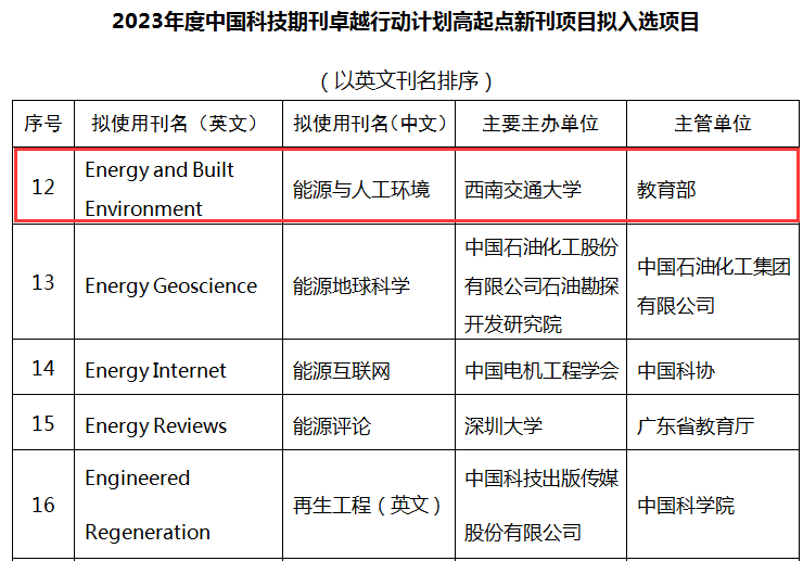主办的国际期刊Energy and Built Environment(简称EBE,中文名称《能源与人工环境》)成功入选,是学校获得的首个中国科技期刊卓越行动计划高起点新刊入选项目,也是继2016年我校主办国际期刊《生物表面与生物摩擦学》成功入选中国科协实施的“中国科技期刊国际影响力D计划项目”之后的再一次跃升与突破,是国家层面对期刊办刊水平的认可。