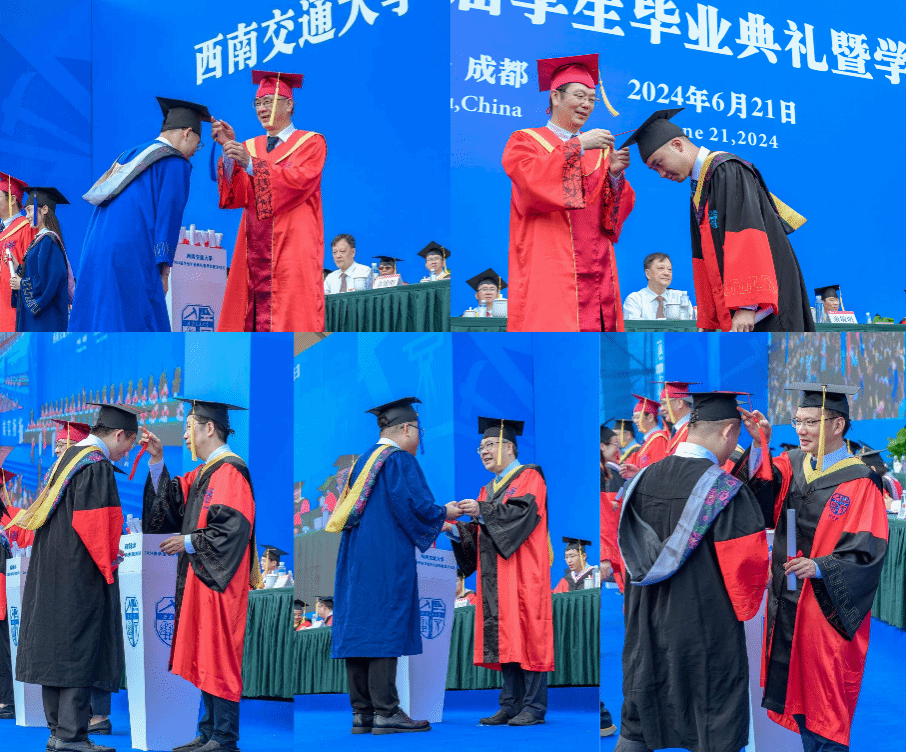 余敏明、闫学东、翟婉明、何川、何正友来到主席台前,依次为毕业生代表授位。毕业生们身着学位服,接过卷轴,拨过流苏,明媚的笑颜和蓬勃的朝气在母校这个盛夏描绘出青春最难忘的画卷。