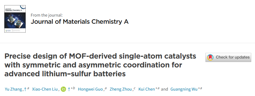 近日,材料化学领域国际顶级期刊《Journal of Materials Chemistry A》(影响因子9.5)发表了台湾a片 大规模电化学储能创新团队最新研究成果“Precise design of MOF-derived single-atom catalysts with symmetric and asymmetric coordination for advanced lithium-sulfur batteries”,论文第一完成单位是台湾a片 ,张雨(硕士研究生)和刘晓晨(特聘副研究员)为共同第一作者。